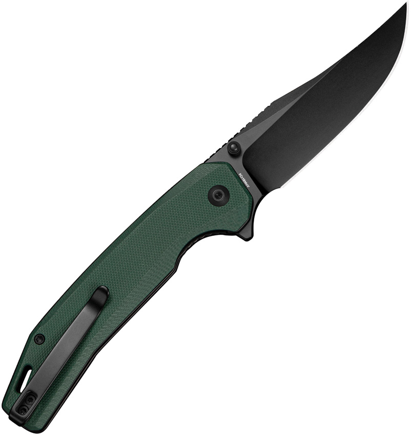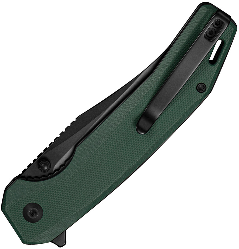 4.75″ (12.07cm) closed. 3.63″ (9.22cm) black finish 9Cr18MoV stainless clip point blade. Green G10 handle. Extended tang. Thumb stud. Lanyard hole. Pocket clip. Black nylon zippered storage case. Boxed.