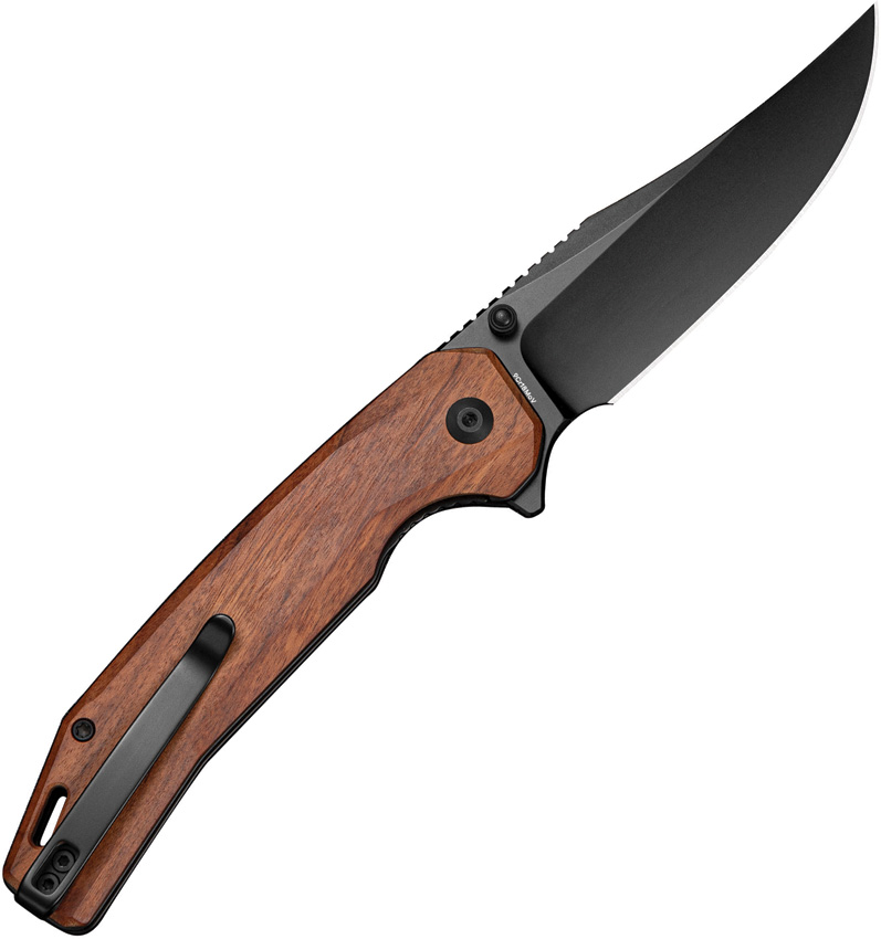 4.75″ (12.07cm) closed. 3.63″ (9.22cm) black finish 9Cr18MoV stainless clip point blade. Brown wood handle. Extended tang. Thumb stud. Lanyard hole. Pocket clip. Black nylon zippered storage case. Boxed.