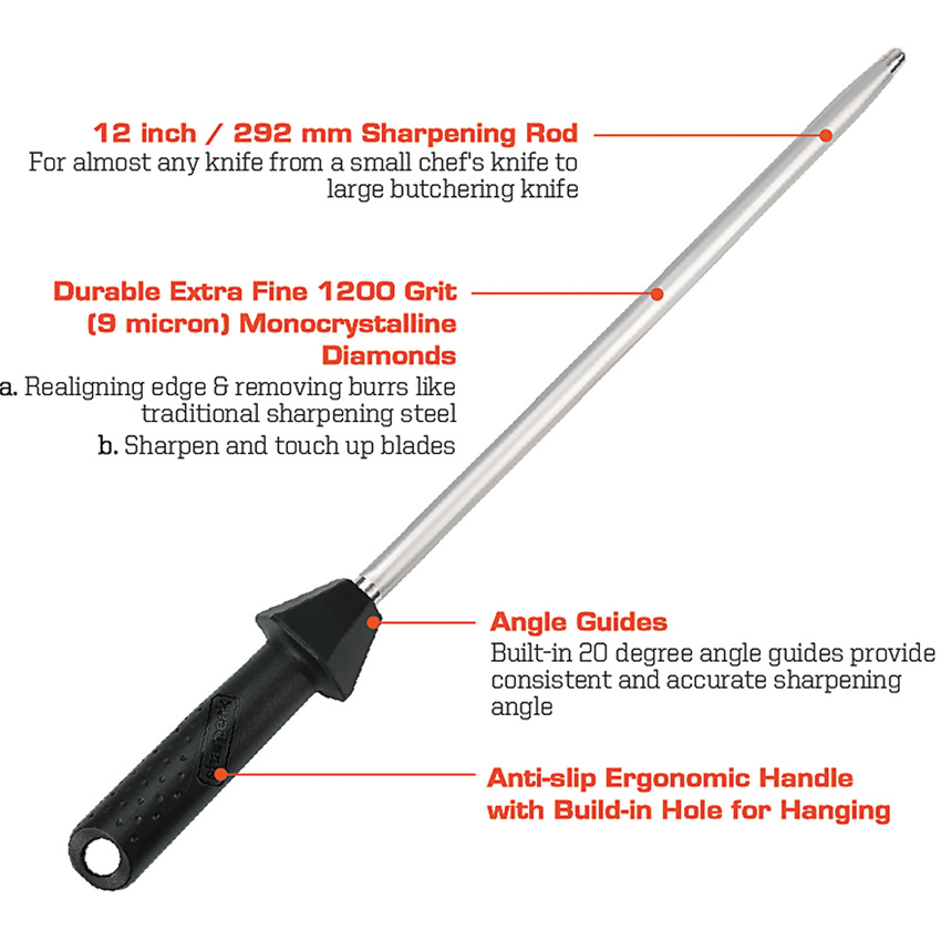 17.5″ overall. Lanyard hole. 12″ monocrystalline diamond rod (1200 grit). Built-in 20 degree angle guides. Hexagonal hand guard. Boxed.
