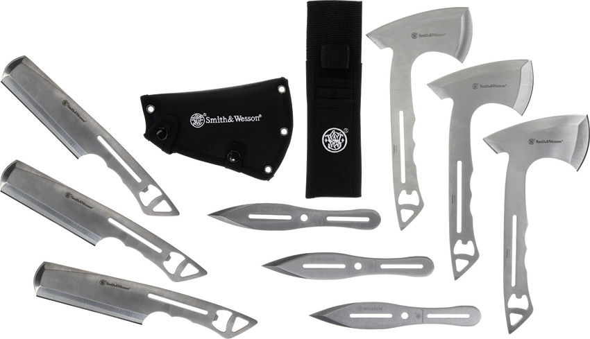 Includes: (3) 10″ overall Hawkeye throwing axe, stainless construction with integrated bottle opener and synthetic sheath; (3) 10″ overall throwing cleavers, stainless construction with integrated bottle opener and synthetic sheath; (3) 8″ overall throwing knives, stainless construction with synthetic sheath; (4) Throwing cards, stainless construction with textured grip back abd synthetic sheath. Boxed.