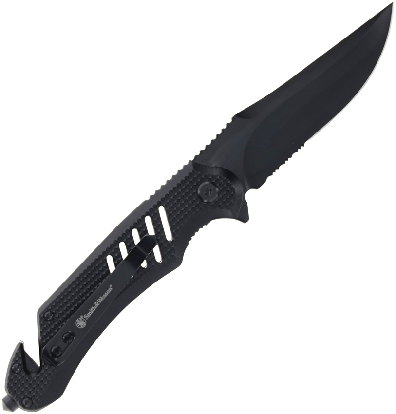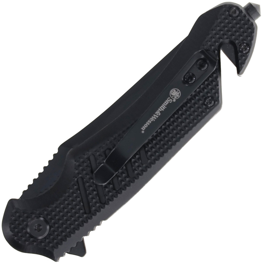 4.75″ (12.07cm) closed. 3.5″ (8.89cm) black finish partially serrated stainless clip point blade. Black textured aluminum handle. Extended tang. Thumb stud. Belt/cord cutter. Glass breaker. Pocket clip. Boxed.