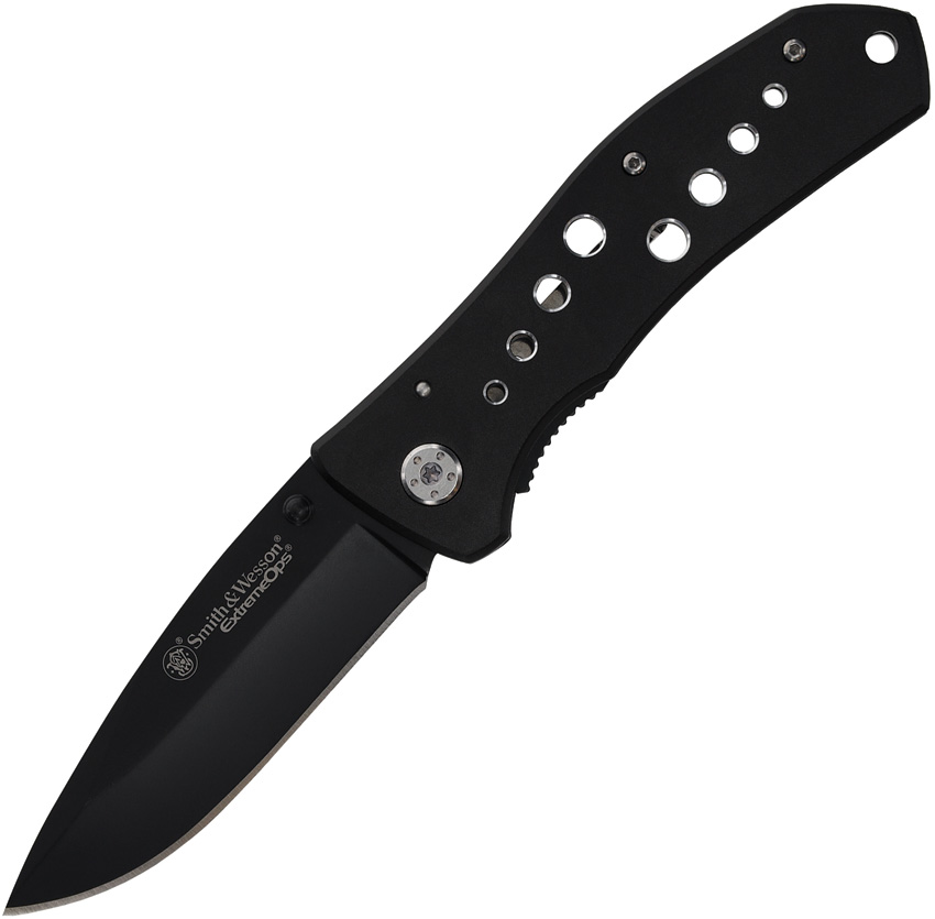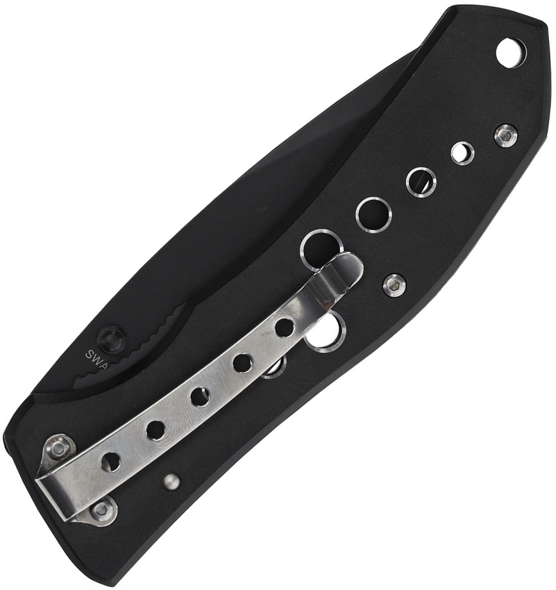 4.5″ (11.43cm) closed. 3.5″ (8.89cm) black finish stainless drop point blade. Black aluminum handle. Thumb stud. Lanyard hole. Pocket clip. Clam packed.