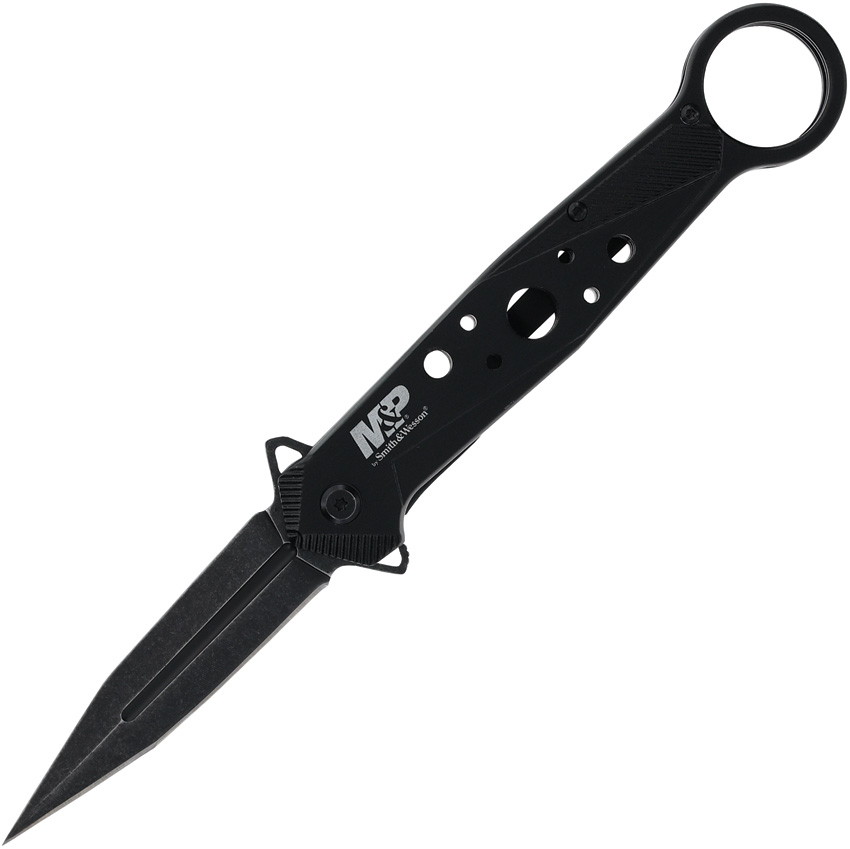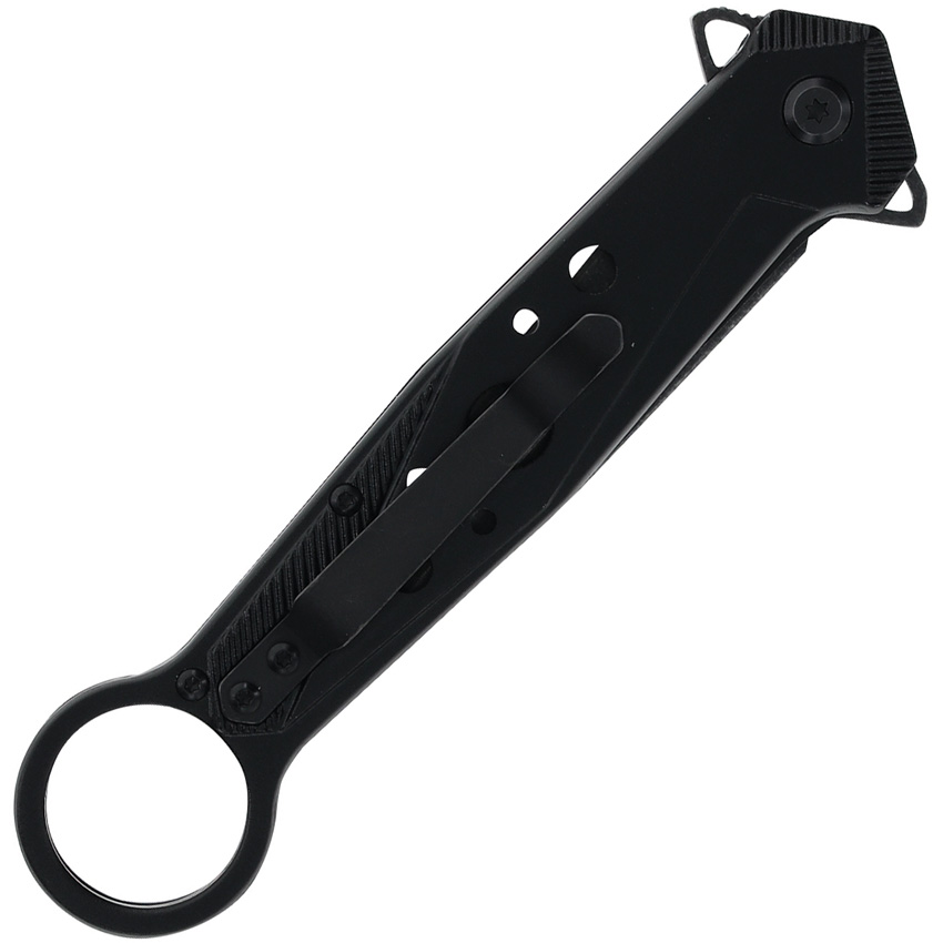 5.5″ (13.97cm) closed. 3.25″ (8.26cm) black stonewash finish false edge stainless dagger blade. Black aluminum handle. Finger ring. Extended tang. Pocket clip. Boxed.