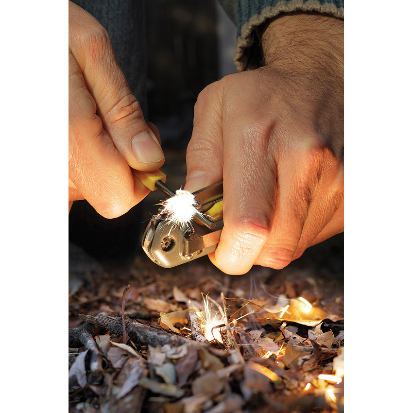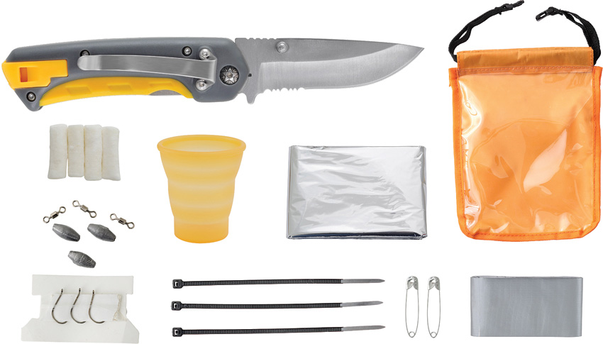 4 1/8″ closed linerlock with stainless partially serrated blade and gray and yellow composition handles with stainless pocket clip. Survival kit contains: fire starter and diamond sharpening rod which store inside knife handle. Kit also includes: duct tape; fire tinder; collapsible cup; zip ties; blanket; fishing kit; two safety pins; and water resistant storage pouch. Hang packaged.