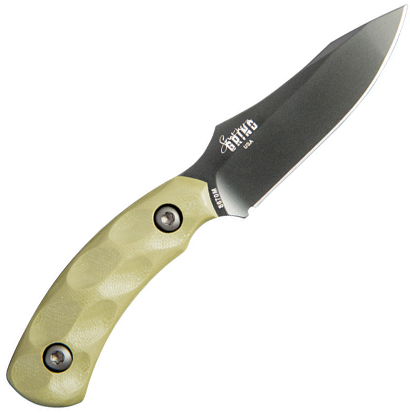 5.75″ overall. 2.88″ black PVD coated 8670 steel blade. Tan sculpted G10 handle. Full tang. Black Kydex belt sheath. Boxed.