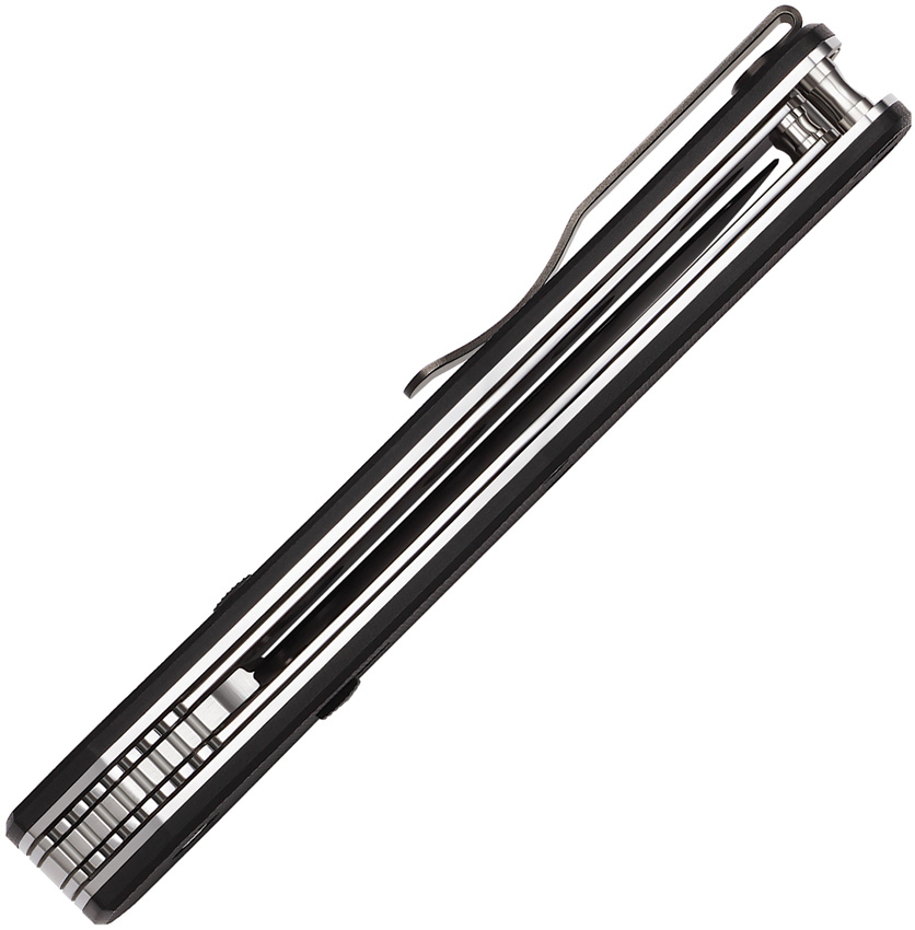 5″ (12.7cm) closed. 3.25″ (8.26cm) satin finish CPM S30V stainless blade. Black G10 handle. Patented mechanism consists of an outer handle, an inner handle, and a full-flat-ground CPM S30V stainless steel blade, all joined by a single pivot pin. Rotating the inner handle 360 degrees reveals the blade and locks it securely in the open position. An ambidextrous sliding latch mechanism reinforces the blade lock when open and also secures the blade and handles in the closed position for safe carry. Boxed.