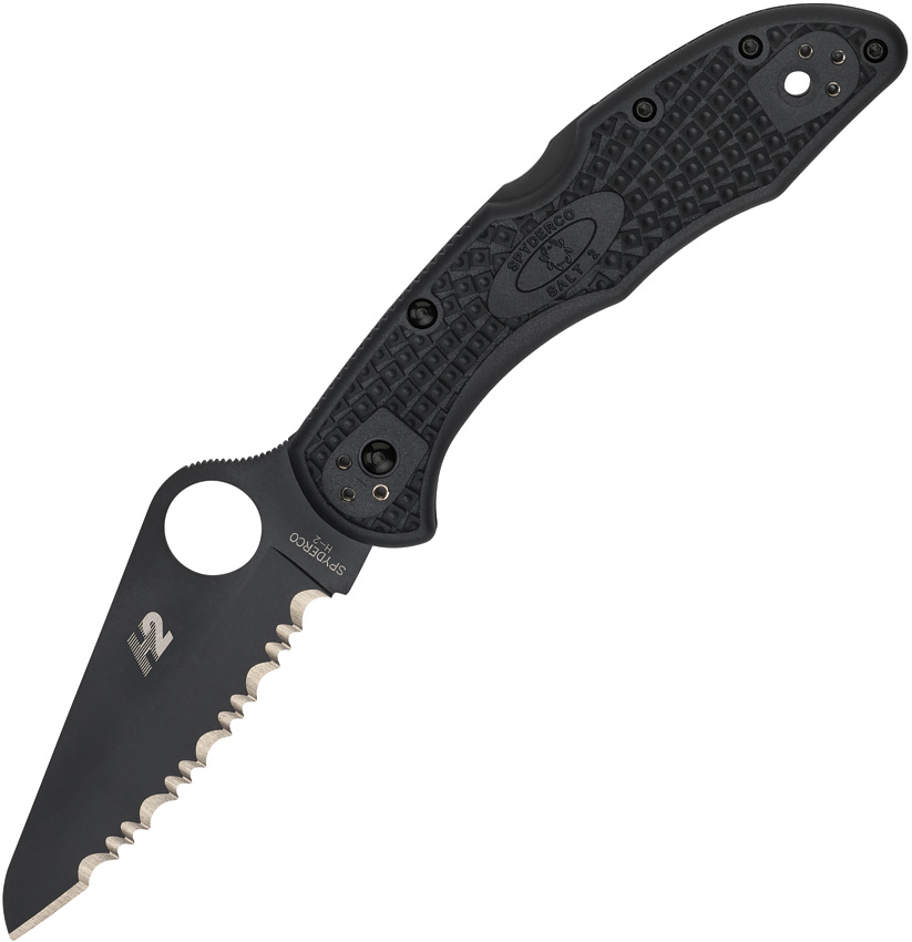 Salt 2 Lockback. 4.25″ closed. 3″ black finish serrated H1 steel drop point blade. Black textured FRN handle. Thumb pull. Pocket clip. Lanyard hole. Boxed.