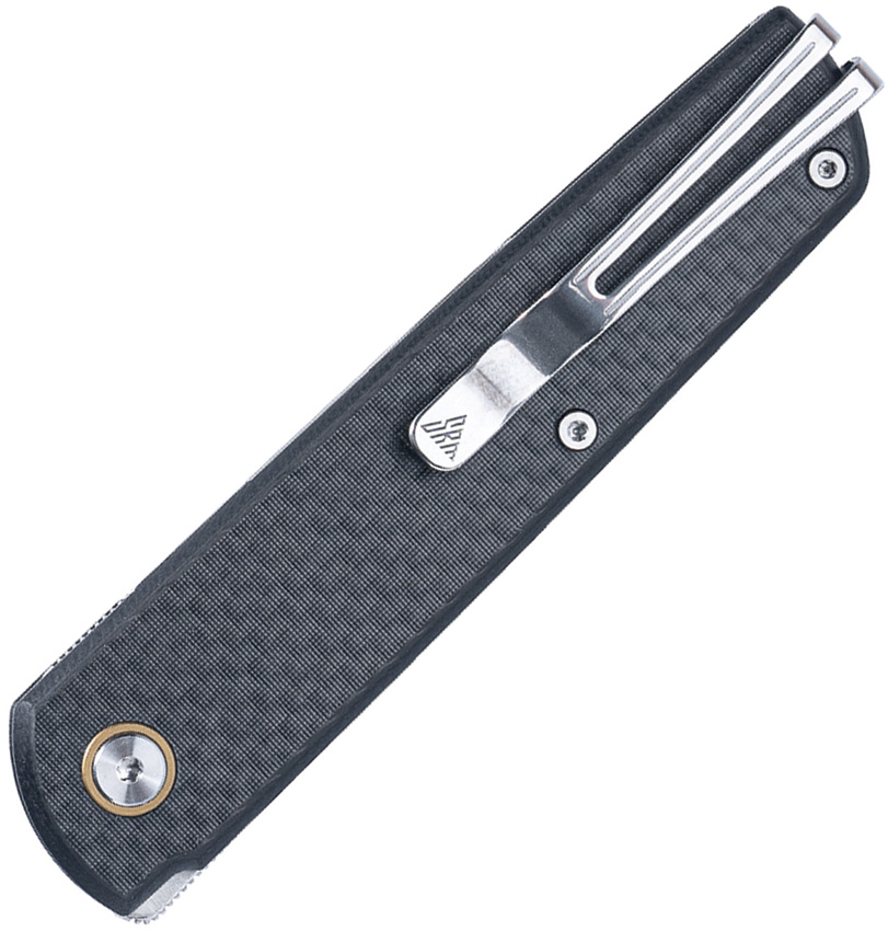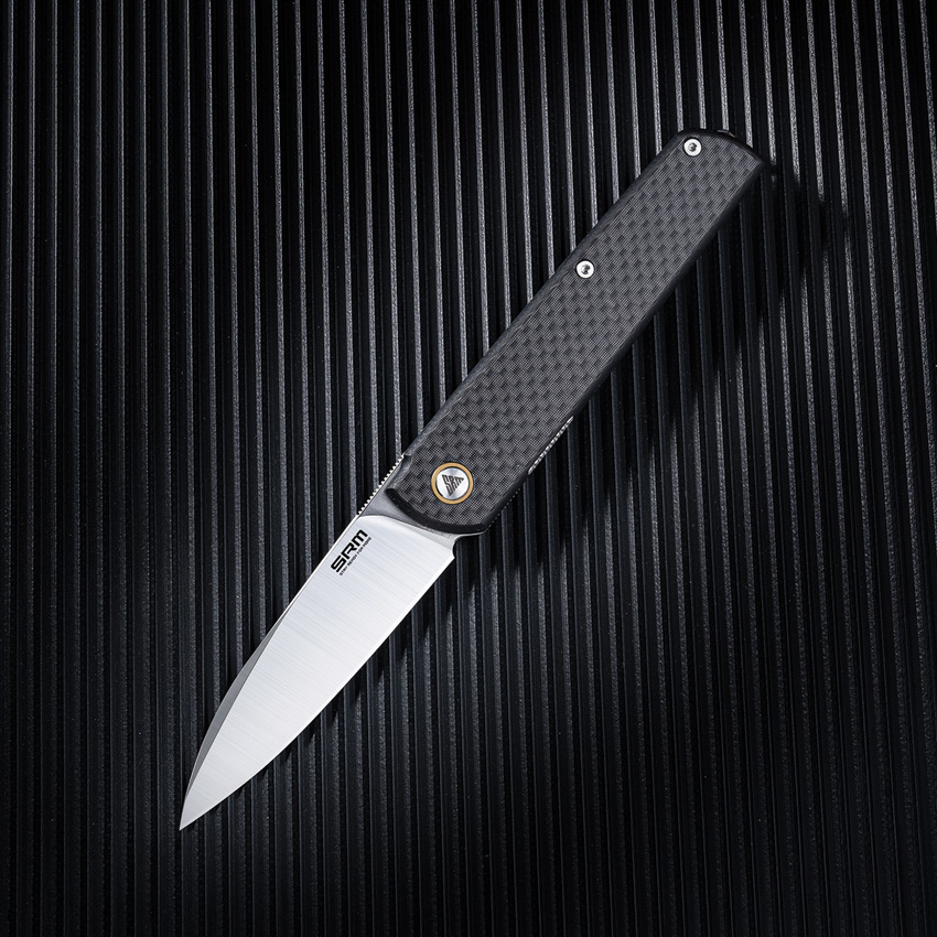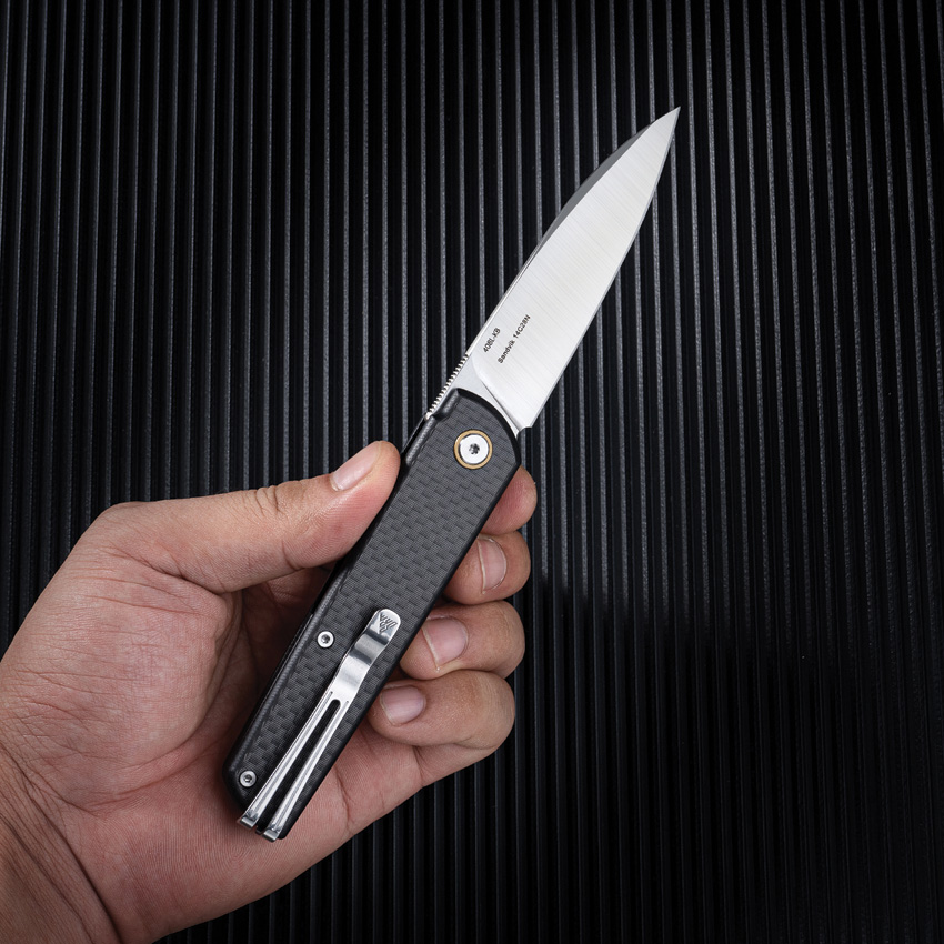 4.25″ (10.8cm) closed. 3.25″ (8.26cm) brushed finish 14C28N Sandvik stainless blade. Black G10 handle with carbon fiber overlay. Extended tang. Pocket clip. Boxed.