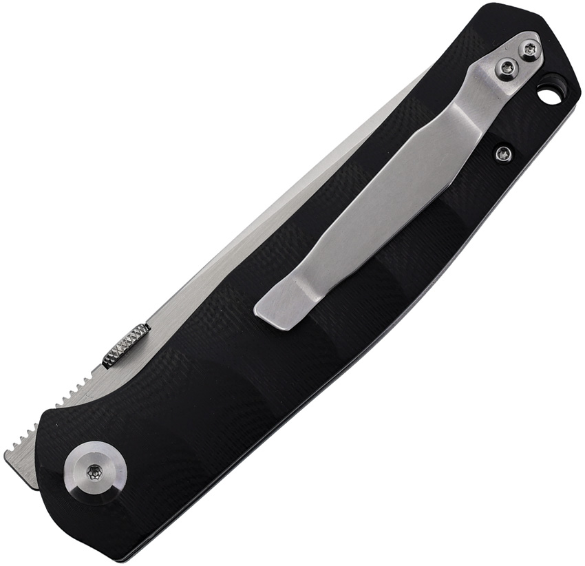 4.5″ (11.43cm) closed. 3.5″ (8.89cm) satin finish D2 tool steel tanto blade. Black sculpted G10 handle. Thumb disk. Pocket clip. Boxed.