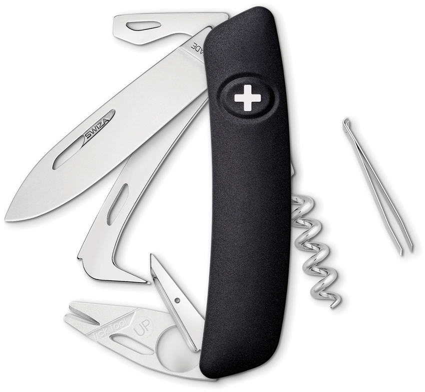 3.75″ closed. Black synthetic handle. Tools include: Blade with safety lock l Flat head screwdriver l Reamer with sewing eye l Corkscrew l Tweezers I Hoof pick I Tick tool. Boxed.
