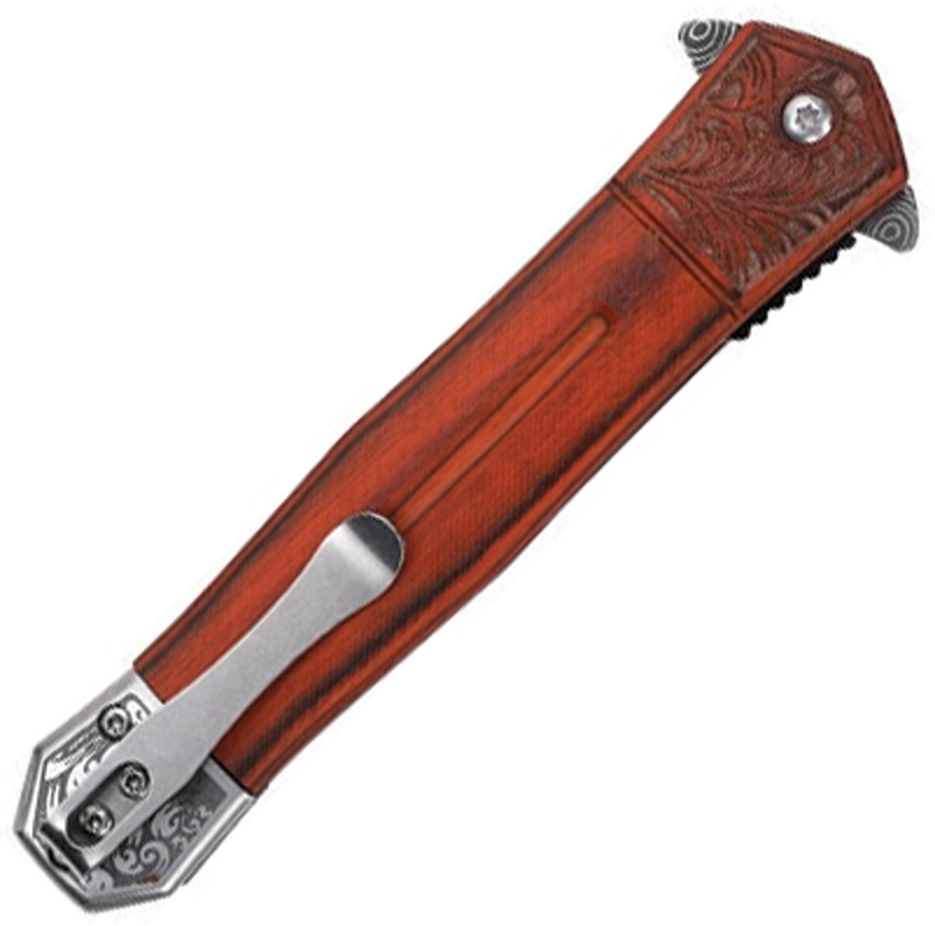 Assisted opening. 5″ (12.7cm) closed. 4.13″ (10.49cm) blade. Brown wood handle. Stainless bolster(s). Extended tang. Pocket clip. Acid etched Damascus pattern stainless blade. Boxed.