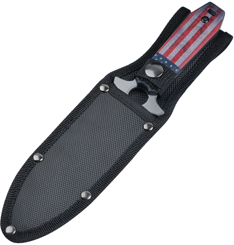 9.5″ (24.13cm) overall. 5.63″ (14.3cm) satin finish double edge 3Cr13MoV stainless dagger blade. American flag pattern nylon handle. Full tang. Lanyard hole. Black nylon belt sheath. Boxed.
