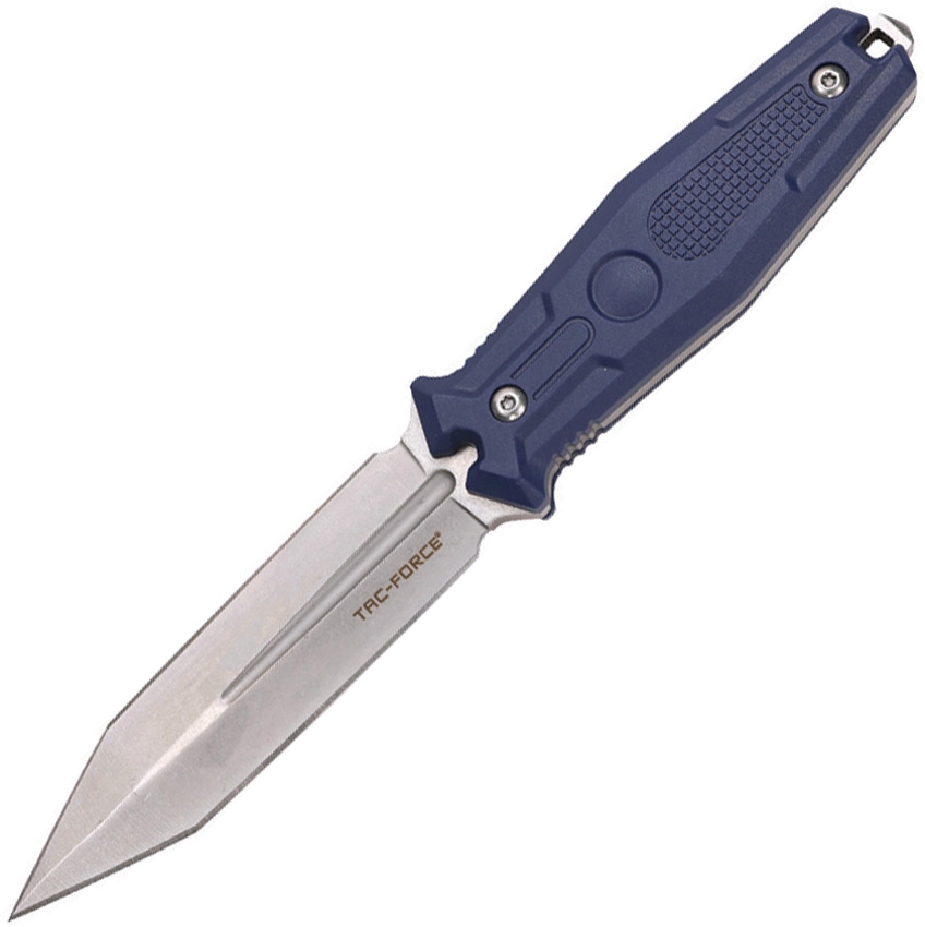 9″ (22.86cm) overall. 4.75″ (12.07cm) satin finish double edge 3Cr13 stainless tanto blade. Blue nylon handle. Full, extended tang. Lanyard hole. Glass breaker. Black nylon belt sheath. Boxed.