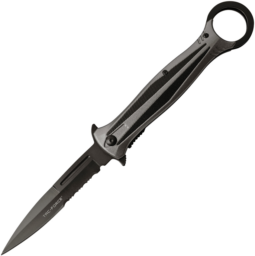 Assisted opening. 5.75″ closed. 4″ black finish partially serrated 3Cr13 stainless blade. Black and gray aluminum handle. Extended tang. Finger ring. Pocket clip. Boxed.