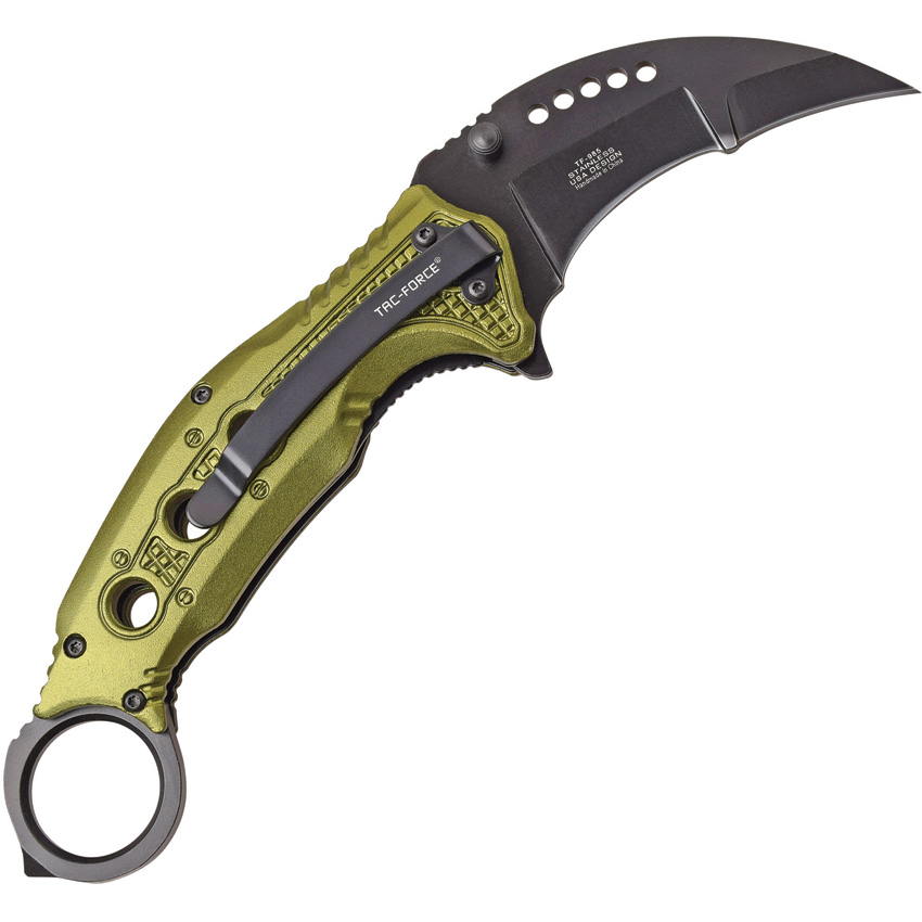 Assisted opening. 5.5″ closed. 3″ black finish 3Cr13 stainless karambit blade. Green anodized aluminum handle. Extended tang. Finger ring. Glass breaker. Pocket clip. Thumb stud. Boxed.