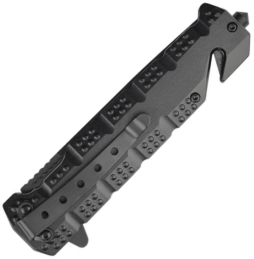 Assisted opening. 4.75″ (12.07cm) closed. 3.5″ (8.89cm) black oxide coated stainless tanto blade. Black anodized aluminum handle. Extended tang. Pocket clip. Belt/cord cutter. Glass breaker. Boxed.