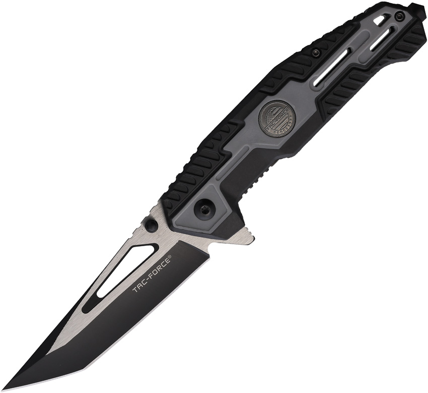 Assisted opening. 4.75″ (12.07cm) closed. 3.5″ (8.89cm) two-tone finish 3Cr13 stainless tanto blade. Black and gray nylon handle. Thumb stud. Extended tang. Glass breaker. Pocket clip. Boxed.