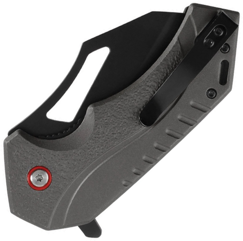 Assisted opening. 4.75″ (12.07cm) closed. 3.5″ (8.89cm) black oxide coated 3Cr13MoV stainless blade. Gray anodized aluminum handle. Extended tang. Thumb pull. Lanyard hole. Pocket clip. Boxed.