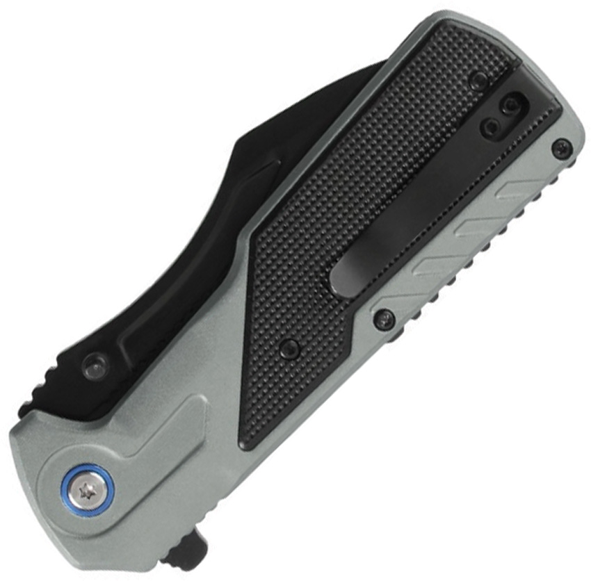 Assisted opening. 4.75″ (12.07cm) closed. 3.5″ (8.89cm) black oxide coated 3Cr13MoV stainless blade. Gray anodized aluminum handle with black acrylic inlay. Extended tang. Thumb stud. Pocket clip. Boxed.