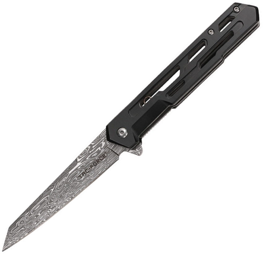 Assisted opening. 5″ (12.7cm) closed. 4″ (10.16cm) acid washed finish 3Cr13MoV stainless reverse tanto blade. Black aluminum handle. Extended tang. Pocket clip. Boxed.