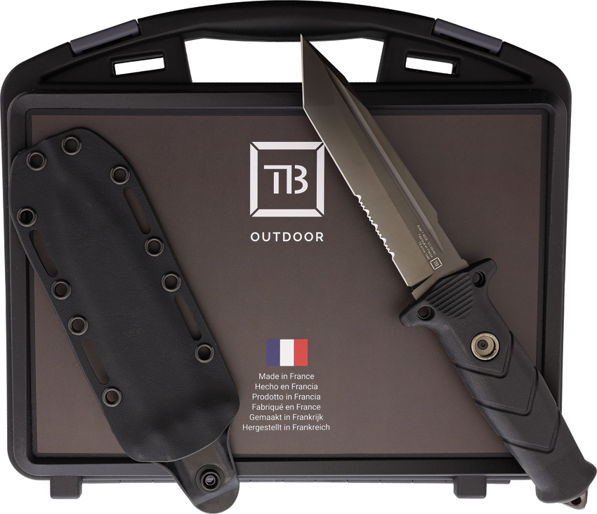 10.25″ (26.04cm) overall. 5″ (12.7cm) black finish partially serrated Nitrox steel tanto blade. Black polymer handle. Glass breaker. Lanyard hole. Black Kydex MOLLE compatible belt sheath. Hardside carrying case.