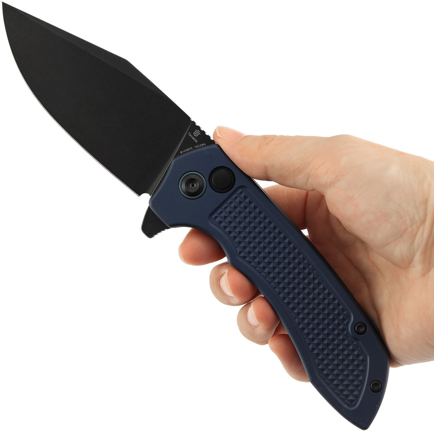 4.5″ (11.43cm) closed. 3.5″ (8.89cm) BlackWash finish 14C28N Sandvik stainless drop point blade. Blue checkered aluminum handle. Extended tang. Pocket clip. Boxed.