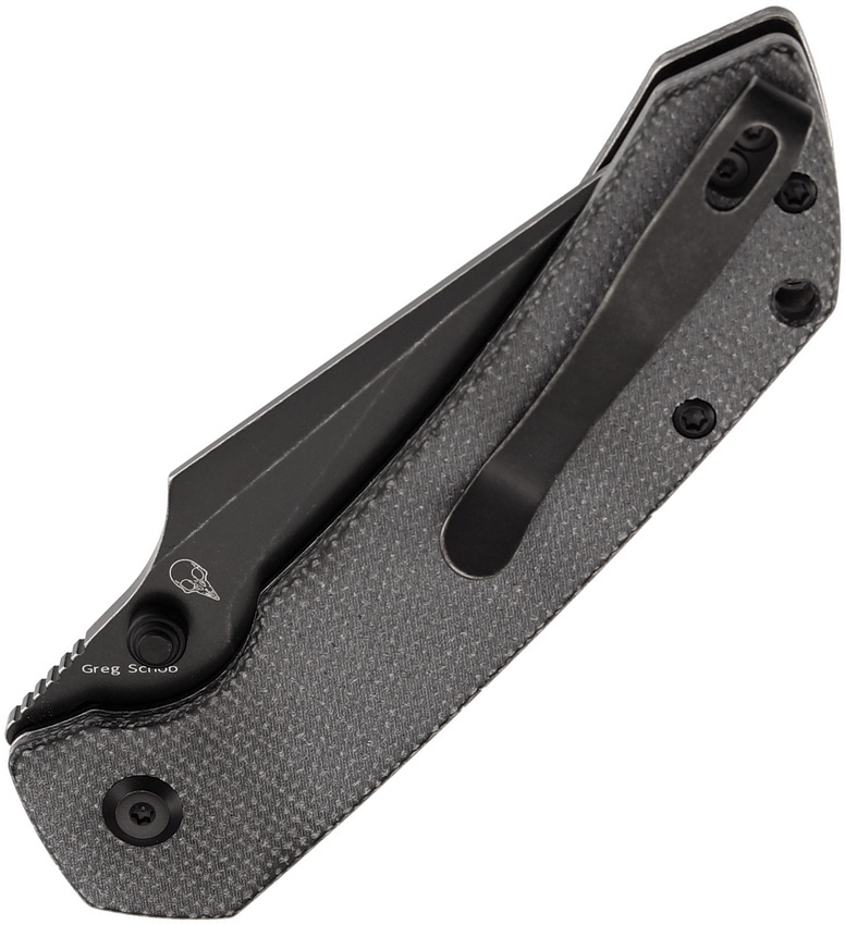 4.5″ (11.43cm) closed. 3.5″ (8.89cm) black stonewash finish 14C28N Sandvik stainless harpoon style blade. Black canvas micarta handle. Thumb stud. Lanyard hole. Pocket clip. Boxed.