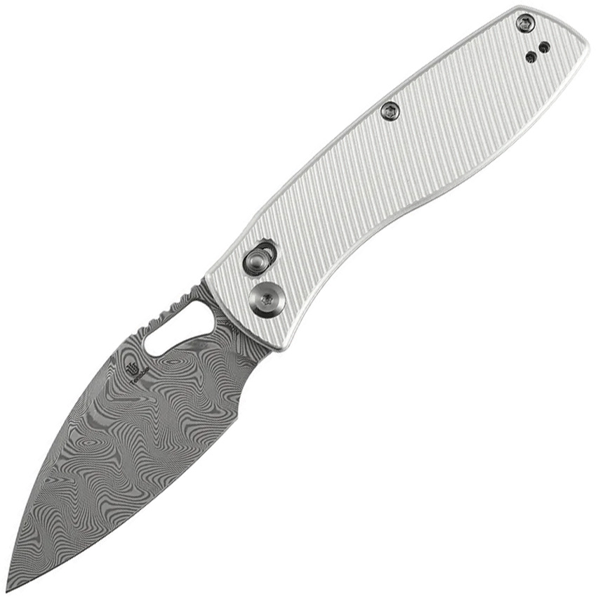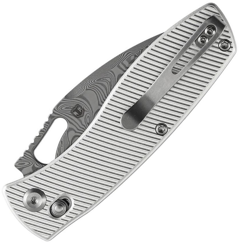 4″ (10.16cm) closed. 3.13″ (7.95cm) Damascus steel blade. Silver aluminum handle. Thumb pull. Pocket clip. Micro milled handle. Water Ripple blade. Boxed.