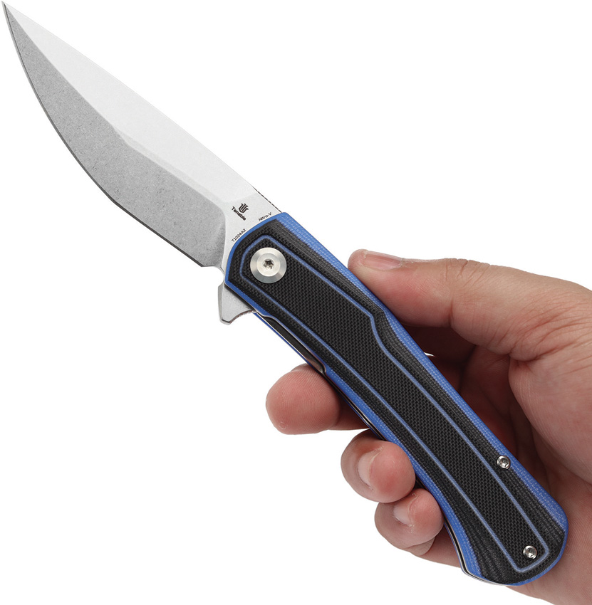 4.88″ (12.4cm) closed. 3.75″ (9.53cm) stonewash finish Nitro V steel drop point blade. Black and blue G10 handle. Extended tang. Pocket clip. Boxed.