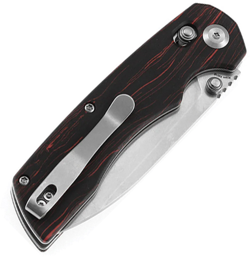 4.5″ (11.43cm) closed. 3.5″ (8.89cm) stonewash finish 14C28N Sandvik stainless drop point blade. Black and red G10 G-Mascus handle. Thumb stud. Pocket clip. Boxed.