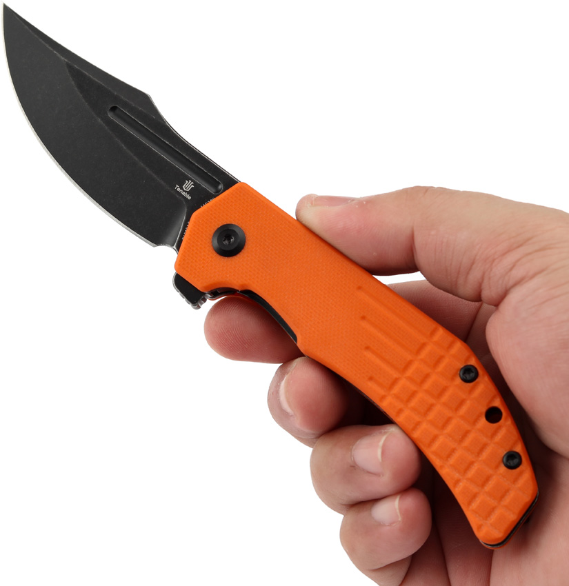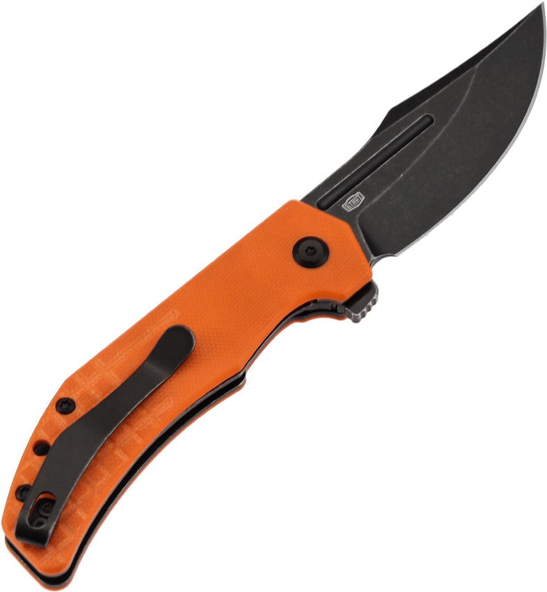 4.13″ (10.49cm) closed. 3.13″ (7.95cm) black stonewash finish 14C28N Sandvik stainless clip point blade. Orange frag pattern G10 handle. Extended tang. Lanyard hole. Pocket clip. Boxed.