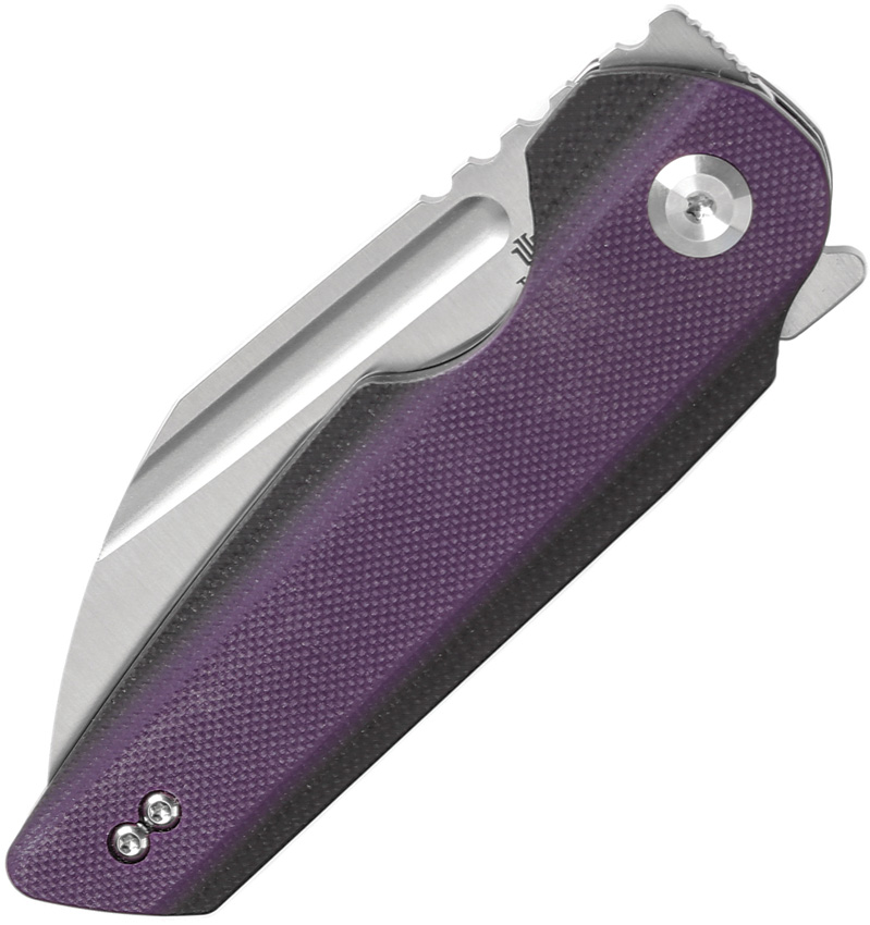 4.25″ (10.8cm) closed. 3.25″ (8.26cm) satin finish 14C28N Sandvik stainless sheepsfoot blade. Black and purple G10 handle. Extended tang. Pocket clip. Boxed.