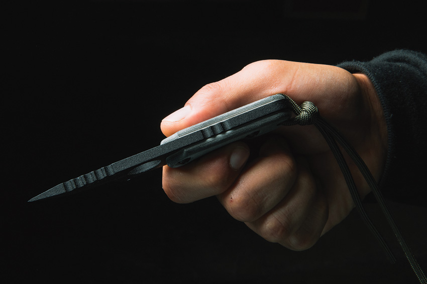 (Anywhere Last Resort Tool). 5 3/8″ overall. 2 5/8″ black traction coated 1095 high carbon steel blade. Full tang. Black linen micarta handles with lanyard. Black injection molded belt sheath.