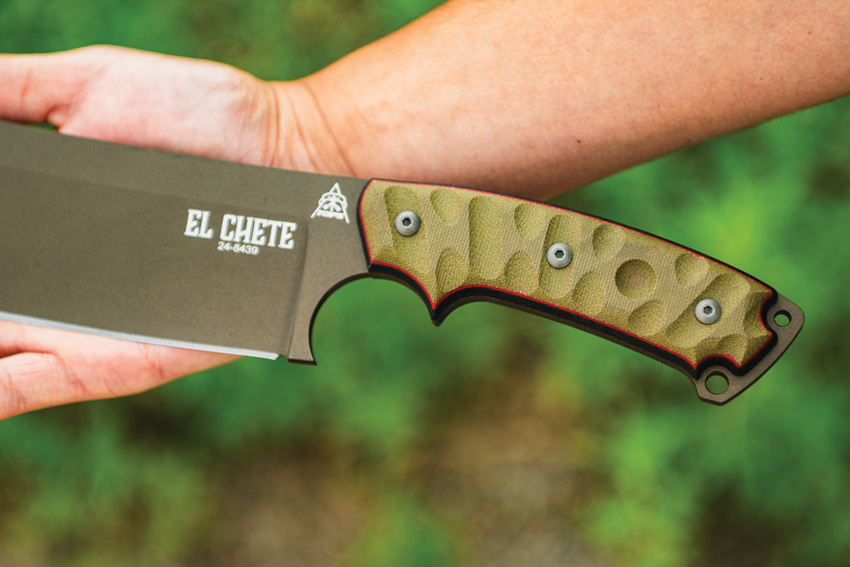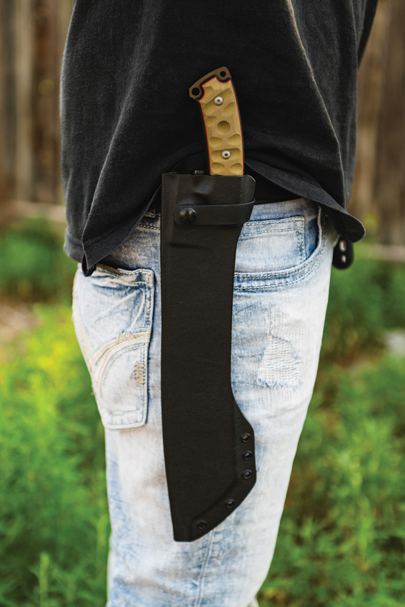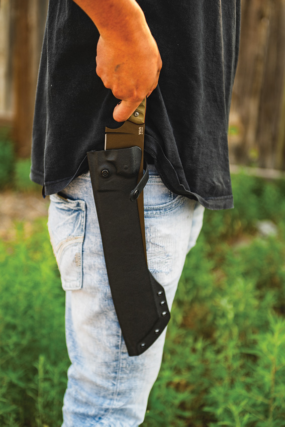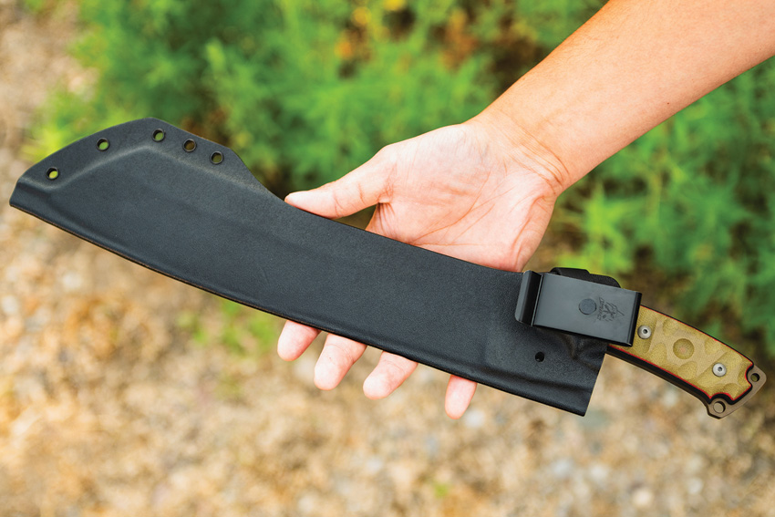 17.5″ (44.45cm) overall. 12″ (30.48cm) 1095HC steel blade. Tan canvas micarta handle. Full, extended tang. Lanyard hole. Midnight bronze blade. Rocky Mountain Tread handle. Black Kydex belt sheath. Bulk packed.