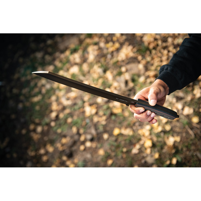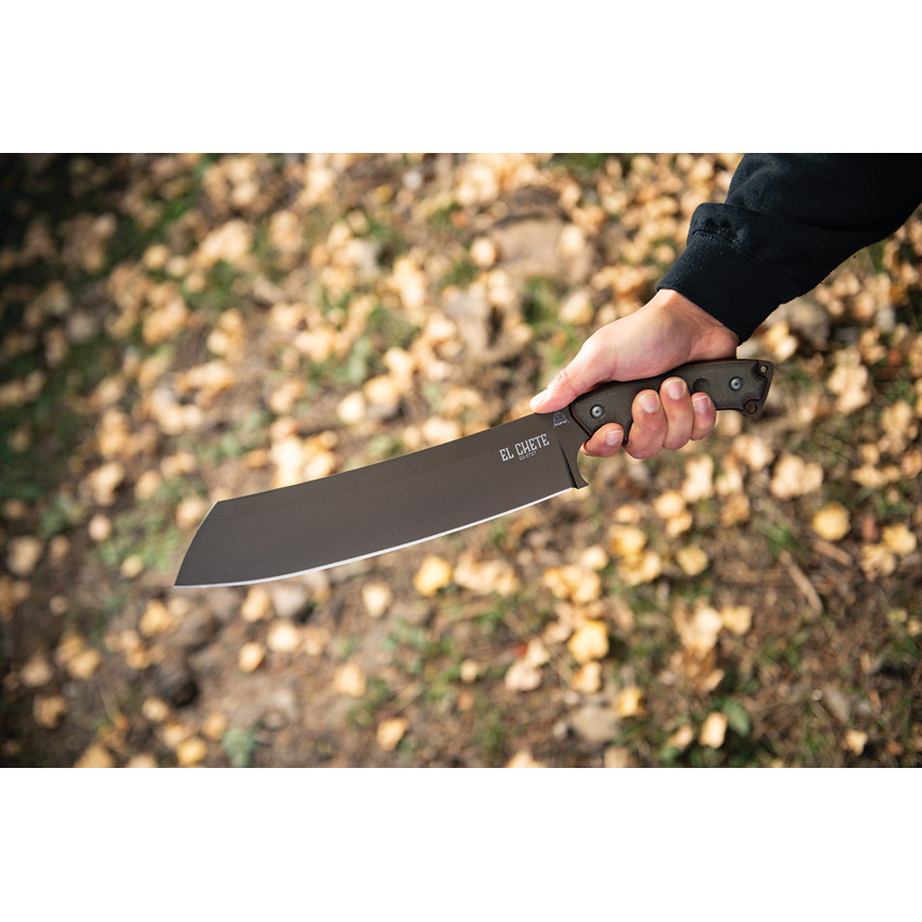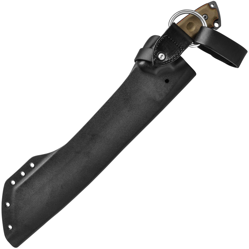 17.5″ (44.45cm) overall. 12″ (30.48cm) 1095HC steel blade. Green and black canvas micarta handle. Full, extended tang. Lanyard hole. Midnight bronze finish blade. Black Kydex belt sheath. Designed by Leo Espinoza. Bulk packed.
