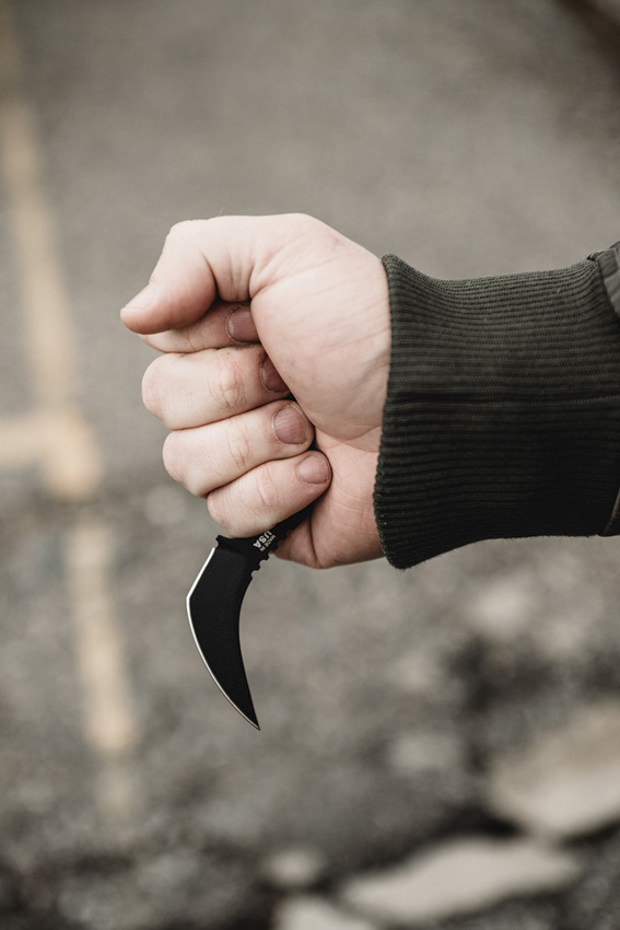 6.63″ (16.85cm) overall. 2.63″ (6.68cm) black powder coated 1095HC steel blade. Black sculpted G10 handle. Full tang. Black Kydex belt sheath. Bagged.