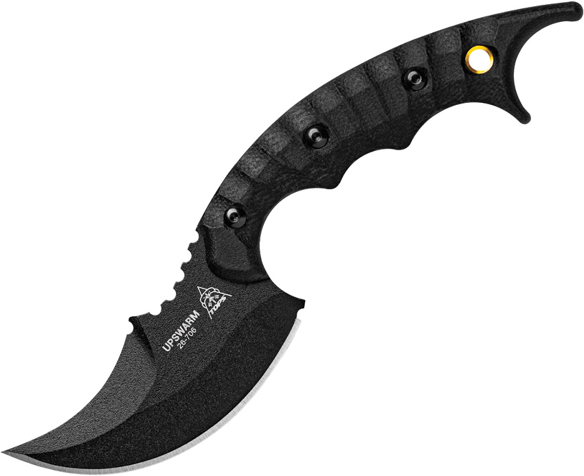 6.75″ (17.15cm) overall. 3″ (7.62cm) black traction coated 1095HC steel blade. Black canvas micarta handle. Full tang. Lanyard hole. Rotating spring steel clip. Black Kydex belt sheath. Boxed.