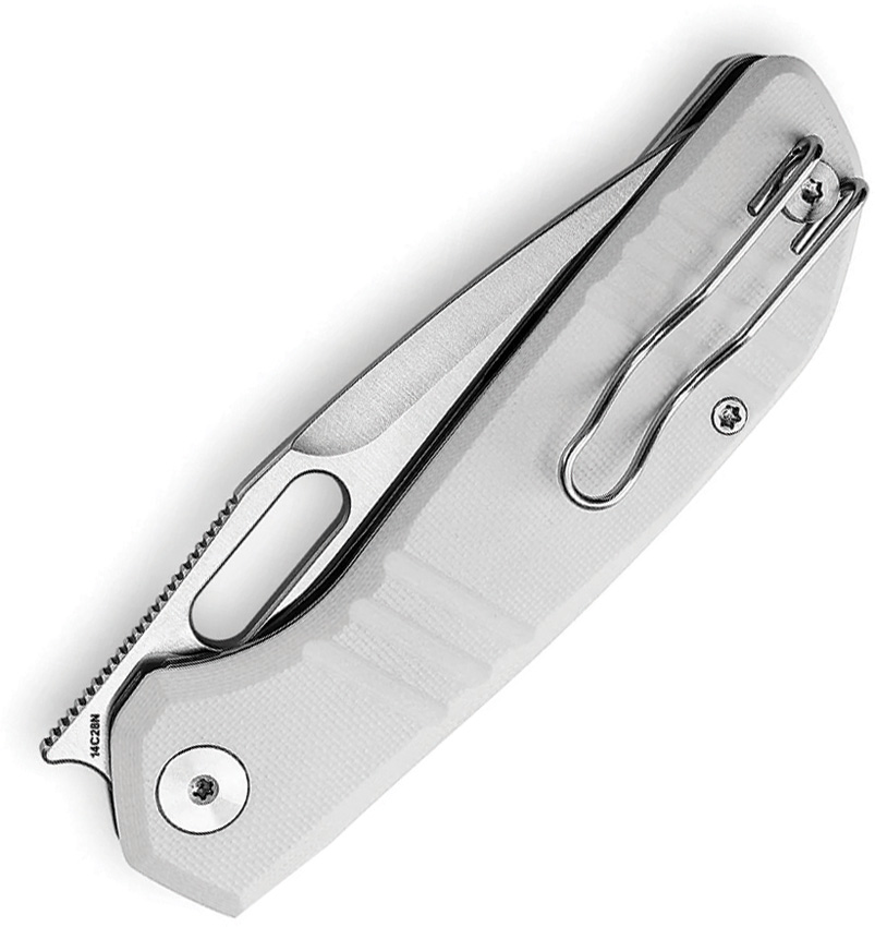 4.38″ (11.13cm) closed. 3.38″ (8.59cm) satin finish 14C28N Sandvik stainless drop point blade. White G10 handle. Thumb pull. Pocket clip. Extended tang. Boxed.