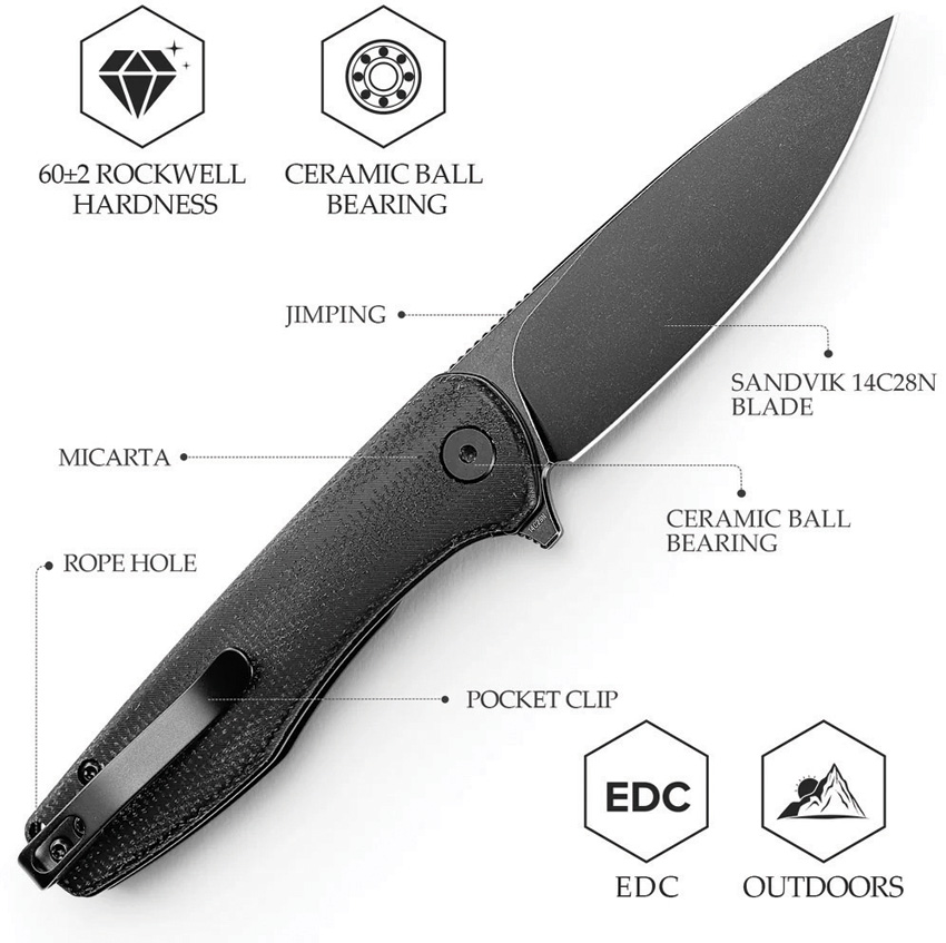 3.88″ (9.86cm) closed. 3″ (7.62cm) black stonewash finish 14C28N Sandvik stainless drop point blade. Black canvas micarta handle. Extended tang. Lanyard hole. Pocket clip. Boxed.