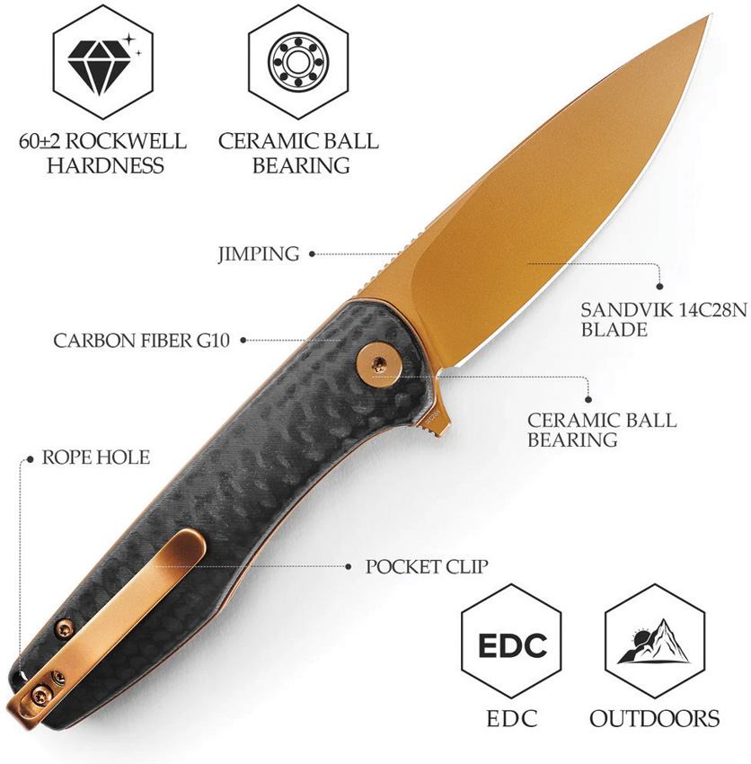 3.88″ (9.86cm) closed. 3″ (7.62cm) gold coated 14C28N Sandvik stainless drop point blade. Extended tang. Lanyard hole. Pocket clip. Carbon fiber G10 handle. Boxed.