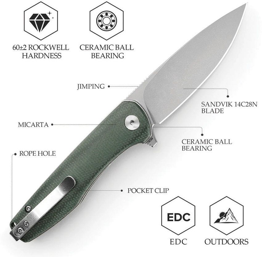 3.88″ (9.86cm) closed. 3″ (7.62cm) stonewash finish 14C28N Sandvik stainless drop point blade. Green canvas micarta handle. Extended tang. Lanyard hole. Pocket clip. Boxed.