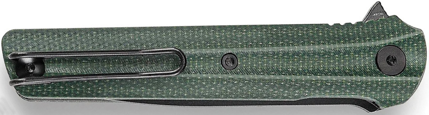 4.25″ (10.8cm) closed. 3.38″ (8.59cm) black stonewash finish 14C28N Sandvik stainless blade. Green canvas micarta handle. Extended tang. Pocket clip. Boxed.