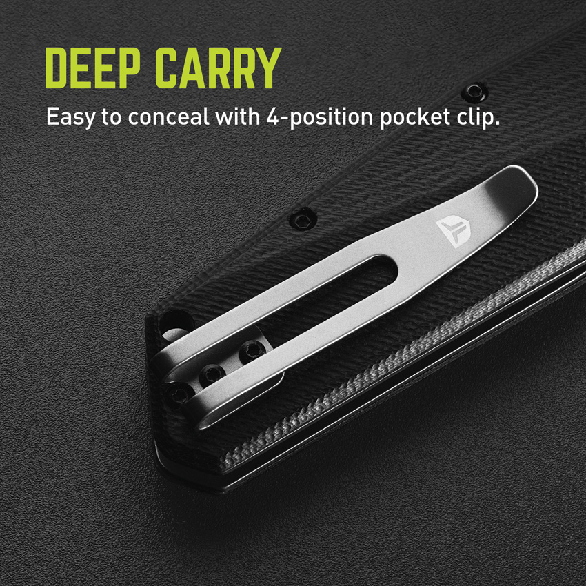 4.5″ (11.43cm) closed. 3.5″ (8.89cm) gray TiNi coated 7Cr17MoV stainless tanto blade. Black G10 handle. Thumb pull. Lanyard hole. Pocket clip. Clam packed.