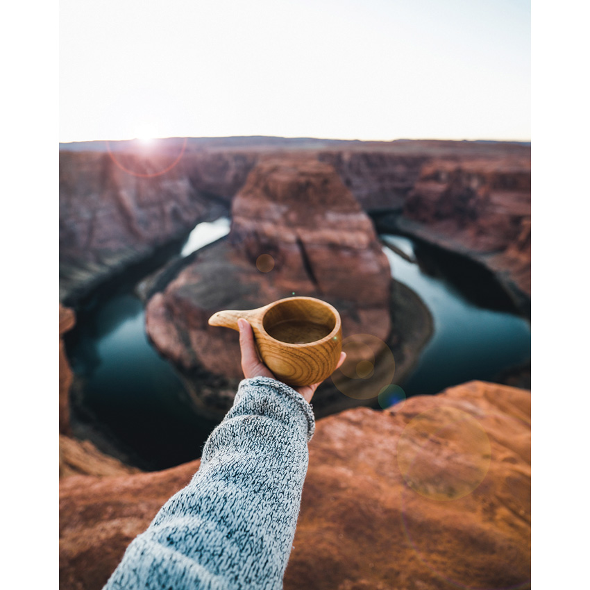 Handcrafted hardwood. Sealed with food-grade, BPA-free finish. Capacity can vary between 10-12 fl. oz. Boxed.