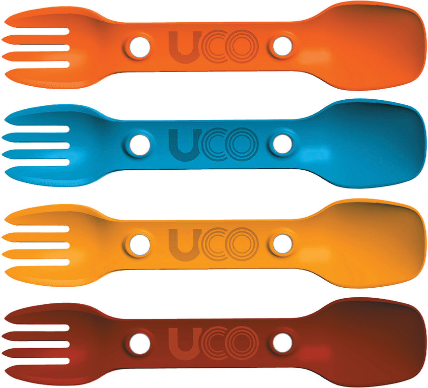 7″ overall. Dishwasher safe. BPA free. Food grade. Serrated edge on fork tine for cutting. Attachment points and reusable tether work together to attach to a pack or hang to dry. Stackable design. Classic color pack (Gold, ember, sky blue, red). Glass-filled nylon construction. Hang packaged.