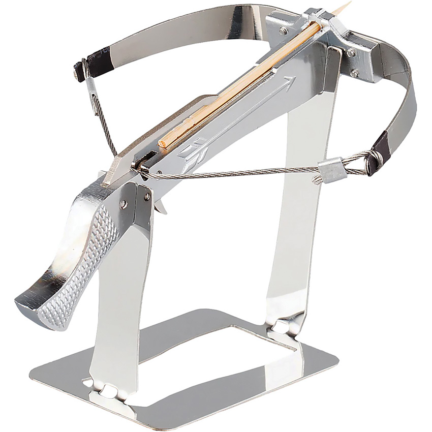 4.13″ overall. Range: 10-15 meters. Can shoot small projectiles like Q-tips, matches, and toothpicks. Comes with (2) metal strings and stand. Stainless construction. Color: Silver. Boxed.