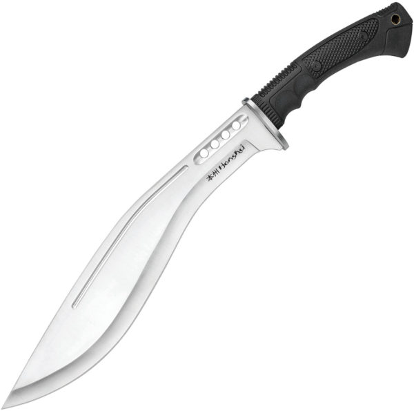 19.63″ overall. 13.13″ satin finish 7Cr17MoV stainless blade. Black TPR handle. Lanyard hole. Inward curving gurka blade profile. Black leather belt sheath. Boxed.