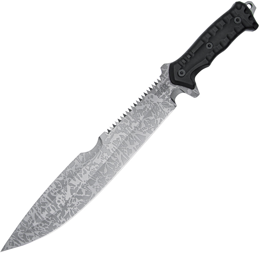 17.75″ (45.09cm) overall. 11.5″ (29.21cm) sawback 3Cr13 stainless blade. Black TPU handle. Full, extended tang. Lanyard hole. Titanium electroplated blade. Black nylon MOLLE compatible belt sheath. Boxed.