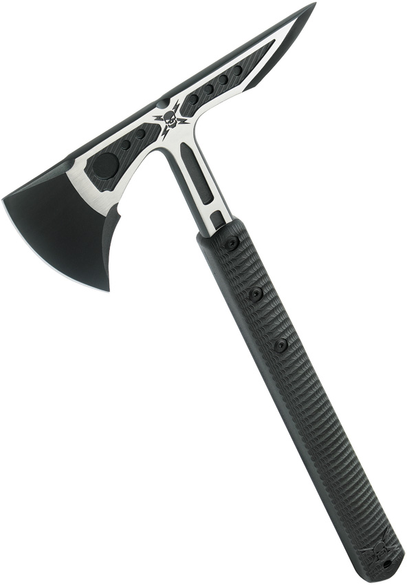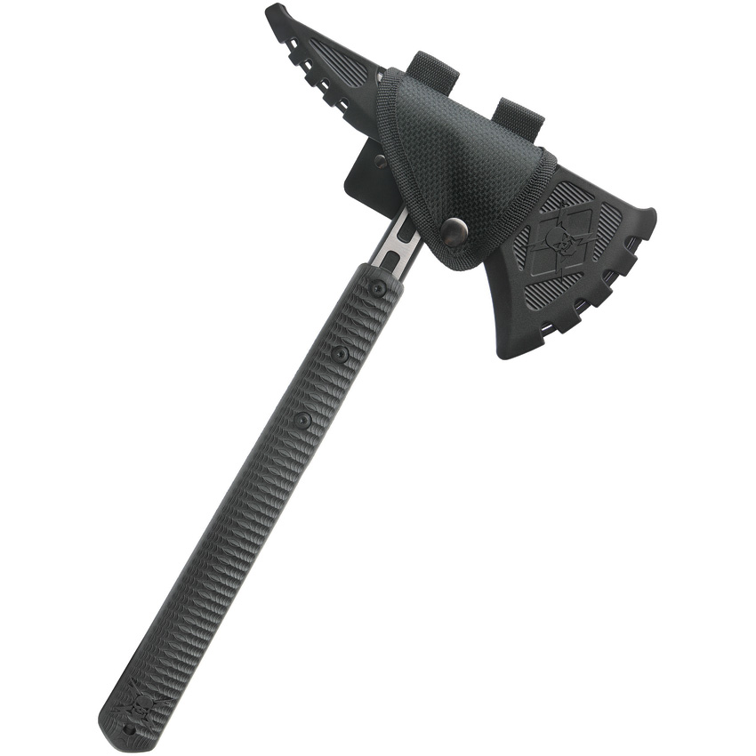 15.75″ overall. 8.38″ two-tone finish 2Cr13 stainless axe head with 3.25″ cutting edge. Black nylon handle. Piercing point end. Black TPU belt sheath. Boxed.