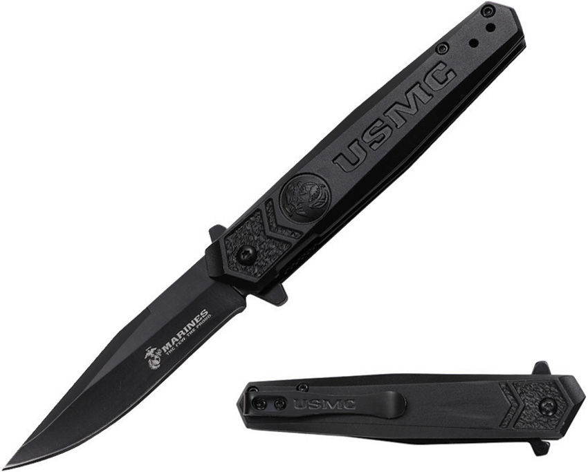 Assisted opening. 4.5″ (11.43cm) closed. 3.38″ (8.59cm) black oxide coated 3Cr13MoV stainless blade. Black anodized aluminum handle. Extended tang. Pocket clip. Boxed.